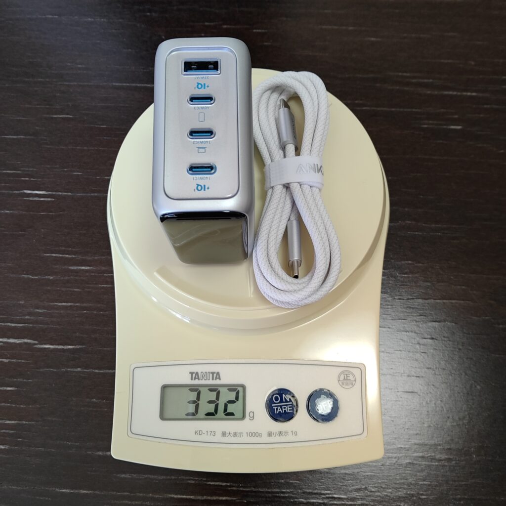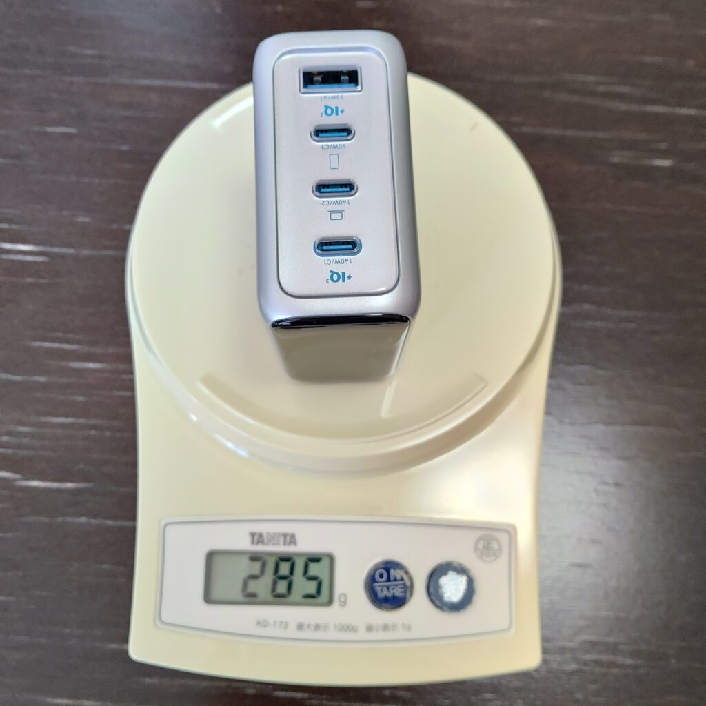 届いた箱を持ってみると、けっこうずっしりきますね。測ってみたら285グラムありました。Apple純正の96wチャージャーが290グラムちょいなので、4ポートあって充電状況がモニタできる画面までついているので頑張ってますね。(付属のケーブルをいれても332グラムでした)