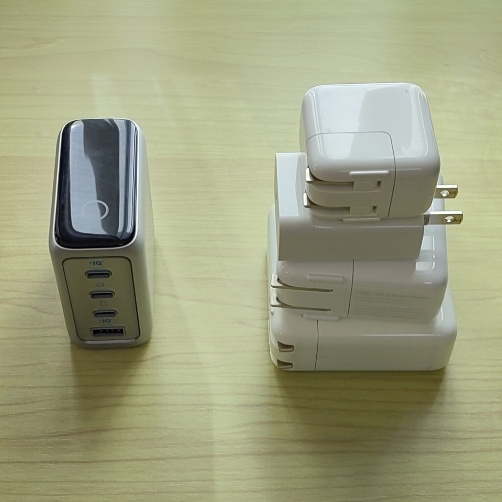 (右が今まで使っていたチャージャー4つ分、それが左のひとつで済みます)