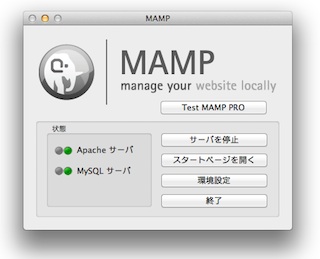 あとはMAMP(アプリケーションフォルダのMAMPフォルダ内のmamp.app)を起動すれば日本語の画面がブラウザで開くので、そこを読めば分かるようになっています。