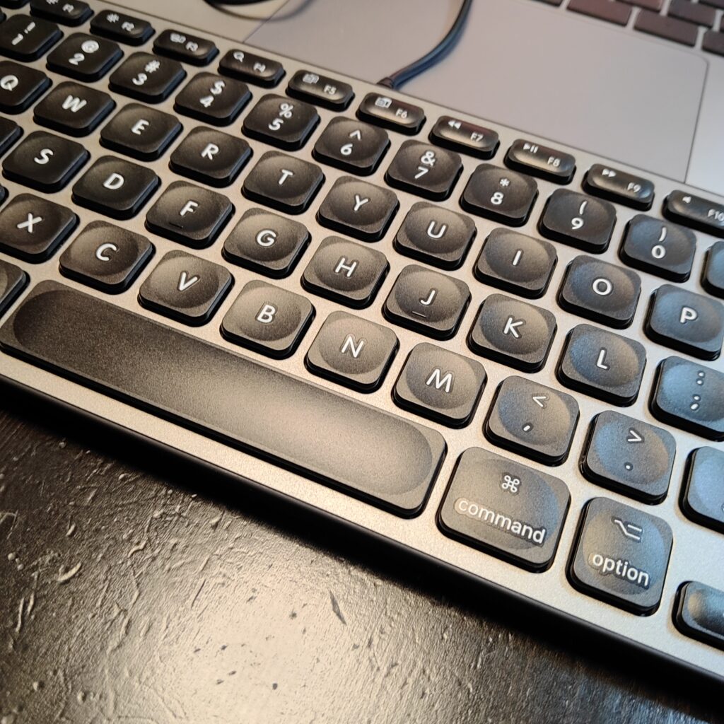 台形キーの一般的なビジネスデスクトップマシンの外付けキーボードなんかよりは、ぜんぜんMacBook Proにぴったりです。もしもあなたがネイルをやっていても爪が削れることはないでしょう。
